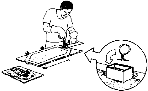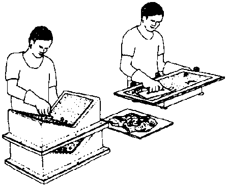 Mesa vibratoria: Está formada por una superficie que vibra y marcos articulados a esta, intercambiables para producir diferentes tipos y espesores de tejas. El dispositivo vibratorio puede ser movido manualmente o alimentado por corriente alterna o por medio de una batería de automóvil.