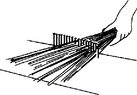 Se cuelgan tiras de bambú de igual longitud de forma tal que sus extremos estén exactamente separado a la misma distancia que la luz del techo. Se colocan cañas de bambú de sección completa en forma horizontal, formando la bóveda invertida. Después se colocan tiras de bambú en el interior, exactamente opuestas a las exteriores. Se taladran perforaciones a través de las tiras y del bambú y se fijan con tornillo o remache.