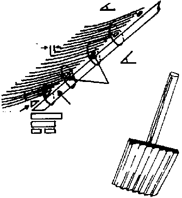 Con estas barras alargadas, se arma la retícula sobre el piso, formando sectores de 50 x 50 cm. Cada nudo se une por un tarugo y además se amarra con una cuerda, para evitar que se suelte, y permitir un movimiento de tijera. Después de elevar el centro de la retícula a la altura requerida, se ubican cañas de 1 m en forma diagonal en las retículas rómbicas, en dirección de la pendiente, y son firmemente amarradas a la estructura, dándole estabilidad.