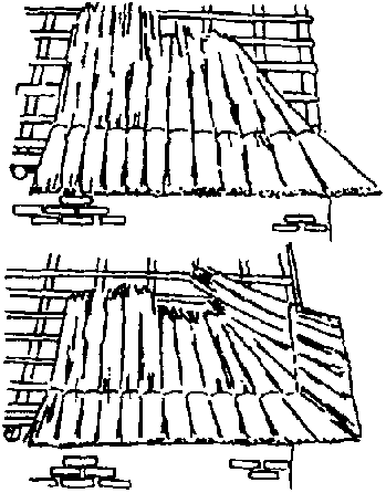 La paja se coloca en capas horizontales de 20 cm de espesor, que se atan con costura, capa a capa, aproximadamente al centro entre el corte y la espiga. Las capas se traslapan, cubriendo y protegiendo las ataduras. El espesor total de la paja es 30 cm. Después de ser fijada, la paja es golpeada con un mazo hacia la atadura. La superficie compacta tiene una inclinación similar a la de las vigas, y solo de 2 a 3 cm de cada atado están expuestos. En la parte superior de cada hilada se deja sobresalir la paja ligeramente, para ser golpeada hacia la atadura conjuntamente con la próxima hilada, eliminando así la huella de la junta.