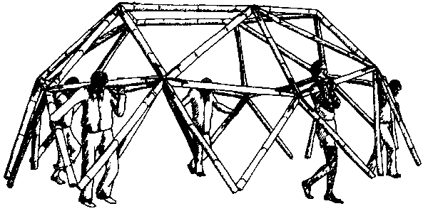 La estructura portante de la cúpula esta compuesta por cañas enteras de bambú de 1.5 m de largo, unidos en una serie de triangulos, logrando así la rigidez necesaria. El largo de los elementos de bambú son determinados por el diseño geométrico, que require de un corte muy exacto, para lograr una forma regular. Sin embargo, el simple sistema de unión permite ajustes durante el montaje. Para una mayor exactitud en los nudos de unión, en los cuales alternativamente se unen cinco y seis cañas, los extremos del bambú son achaflanados (biselado).