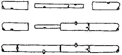 Unión 2: la barra diagonal se apoya sobre pinas insertados a través de la barra superior, por lo cual los pinas soportan ambas, la correa y la barra diagonal. Una elemento intermedio (una especie de arandela) aumenta considerablemente la resistencia.