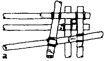Unión 4: pin de bambú atravesando tres barras de bambú, siendo las dos exteriores paralelas.