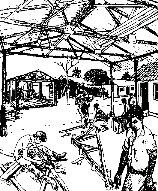 Los bordes de la retícula laminar forman un cuadrado de 6 x 6 m, correspondiendo con las dimensiones de los muros. Una pieza vertical de bambú se fija en cada esquina de los muros, a la que se sujeta una especie de viga solera de bambú. Ésta ubica y sujeta la retícula láminar en su lugar. El techo es cubierto por una membrana impermeable y un material de paja local adecuado, que no sea hierba de tallo rígido. Una posible alternativa es una cobertura de ferrocemento, que se mantendría en su sitio incluso en el caso que la estructura de bambú deje de soportarla.