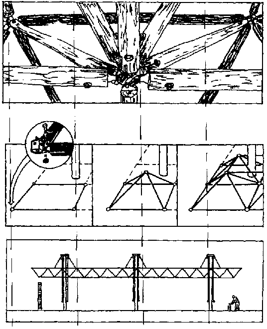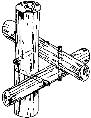 Todos los rollizos son cortados a la misma longitud, digamos 1.5 m, y en los extremos se hace un corte longitudinal con una sierra. Los huecos para los pernos son perforados en ambos extremos, se inserta el conector con la lengüeta en el corte y se fila con el tornillo, la arandela y la tuerca. Después de prefabricar todos los rollizos requeridos, estos son ensamblados sobre el piso, exactamente debajo de su posición final, para ser elevados posteriormente con un sistema de poleas .
