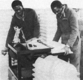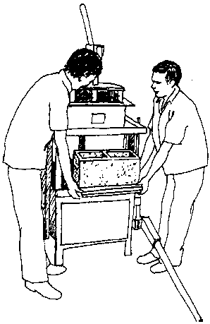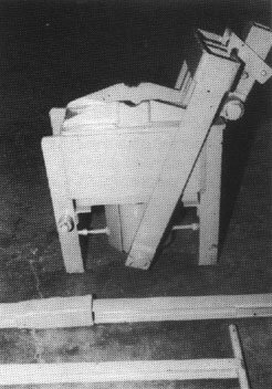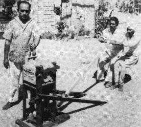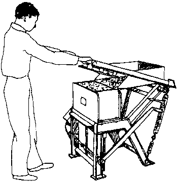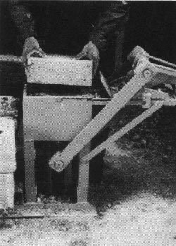 Molde simple para bloques, equipado con una bandeja para preparar la mezcla de cemento-arena. El molde lleno es apisonado manualmente y la superficie superior alisada con una llana. La palanca es empleada para hacer descender la caja y el bloque hueco es volcado sobre un tablero de madera, listo para el curado.