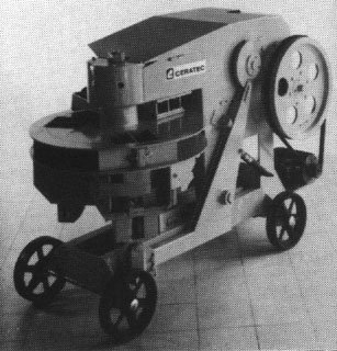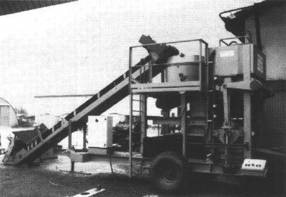 Unidad de producción móvil sobre 4 ruedas, incorpora una criba vibradora, un mezclador de eje horizontal, una tolba y una prensa, todos accionados por un sólo motor diesel. La alimentación de la criba con agua, barro y estabilizador se realiza manualmente, las operaciones restantes funcionan automáticamente (controlado por computadora). Bloques de 29 x 14 x cm., producción de 320 bloques por hora.