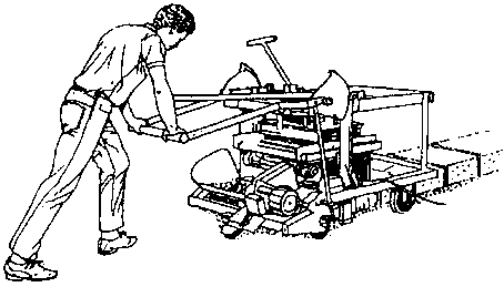 Máquina ponedora automática: la mezcla se abastece por un lado, los bloques huecos son moldeados (por vibración) sobre el suelo y se dejen paradas mientras la máquina se mueve hacia la posición de moldeo siguiente.