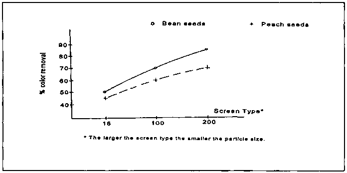 In using ground seeds for water clarification, the size of the particles is an important factor: generally speaking, the smaller the particles, the more efficient the clarification process. This is particularly important in the removal of color using peach and bean seeds (Figure 20). The concentration of the resulting coagulant solution has also an effect on the reduction of turbidity in the product water (Figure 21). For most plant seeds, the lower the pH of the water, the more effective the treatment. Suspended materials coagulate better at lower pH values. Peach seeds are an exception to this rule of thumb. Moringa oleifera was found to be more efficient at reducing turbidity than aluminum sulfate (alum). In general, also, the higher the initial turbidity, the higher the removal rate.