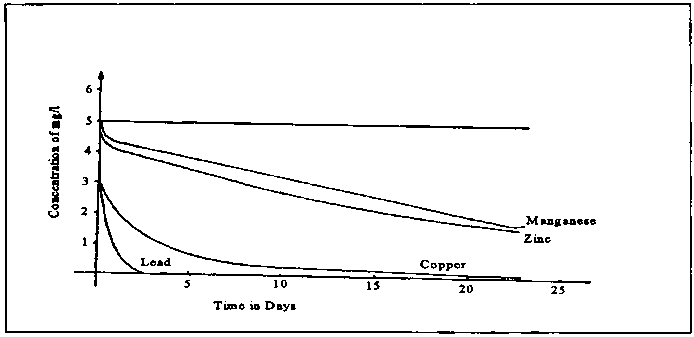 Wetland treatment systems using totora are quite efficient at removing nutrients and oxygen-demanding substances from effluents. Table 9 shows the percentage of removal of chemical compounds from wastewater by the system in Puno. Parasites were also removed from the inflow waters, and total and fecal coliforms were reduced in concentration by 80% and 99%, respectively. The experiments performed in Bolivia on the removal of heavy metals by totora show that lead, silver and copper can be removed from effluents in less than 2 days. Figure 22 shows the decline in concentration of several heavy metals in a typical effluent.