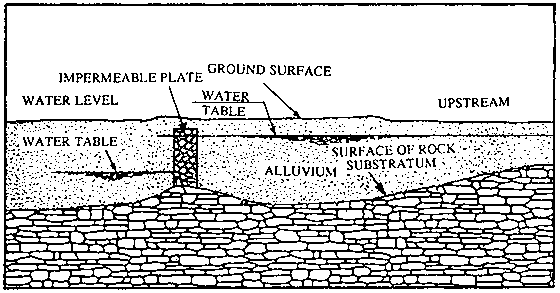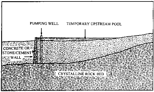 An underground dam is any structure designed to contain underground flow, from a natural aquifer or from an artificial one, built with an impermeable barrier. Two major types have been distinguished in the literature: underground or submersible dams and submerged dams (Santos and Frangipani, 1978; Silva and Rego Neto, 1992), both shown in Figure 45. Underground or submersible dams are defined as dams with walls that begin at the impermeable layer and extend above the surface of the alluvium, causing pools to form upstream during rainy periods. Water is stored both above and below the alluvial surface. The wall of a submerged dam, on the other hand, is entirely enclosed in the alluvium, and water is stored in the saturated soil. These types of dams have been built in northeast Brazil since the turn of the century to augment rural water supplies.