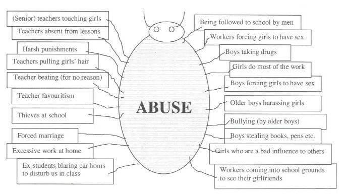 Girls were also able to identify many types of abuse in their school, as shown in the spider diagram below. However, what constituted abuse was not always clearcut. In the family context, the girls were much clearer about this, so that sexual advances by a male relative, beating and other ill-treatment by a parent or relative, excessive domestic duties and extreme neglect were all forms of abuse. However, they were less clear about this in the school context. With regard to corporal punishment, although they were bitter about the beatings they received, 43 girls (38%) thought it was acceptable, at least if given in moderation and for a justifiable reason (table 6). More importantly, the girls' attitude towards sexual advances by male teachers and pupils was ambivalent. They understood that a male relative propositioning them was wrong, they were far less certain about a teacher. They clearly regarded attempts by male teachers to touch and fondle them and their use of insulting or sexually explicit language as forms of abuse. However, they were less certain about a teacher's attempt to form what they might perceive as a serious relationship. The fact that the teacher might be misleading the girl with false promises was not recognised by all the girls. And, while almost all expressed their disapproval of girls having relationships with teachers, it seemed that a very small number of girls did respond positively and may even initiate the advance. This indicated that there was a desire, at least among a few girls, to be associated closely with a teacher, especially the popular ones and those who appeared eligible for marriage. One of the researchers witnessed an occasion when a male teacher (one of those accused by the girls interviewed most frequently of making advances to them) was approaching a group of 4-5 girls and spread out his arms as if to hug them; they responded positively by giggling and smiling.
