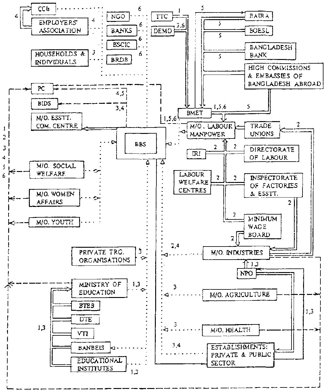 Bangladesh Bureau of Statistics (BBS):- the central government body for population and other censuses in the country. It undertakes a regular Labour Force Survey, the most recent of which was undertaken during 1991-92 and the next of which will take place in 1995-96.Ministry of Labour and Manpower:- the principal and highest level government body that deals with labour market monitoring. It is organised into three divisions, viz: