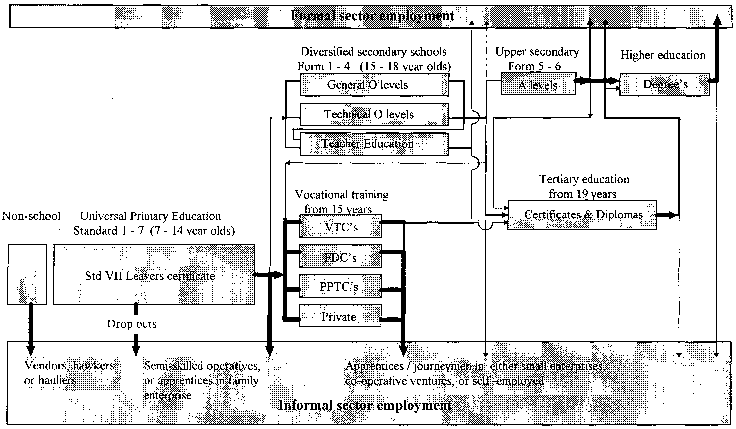 Of more immediate interest is the interface between education, training and employment and the pathways towards employment in the formal and informal sectors. The diagram on the following page illustrates the opportunities and pathways for young people. The thickness of the line represents a crude quantitative indicator of distribution where two or more directions are possible. In addition the numerical data in the following narrative are based on the 1991 Informal Sector Survey. Apprentice or semi-skilled training that is undertaken in the workplace is indicated in the grey areas that denote the formal or informal sectors.