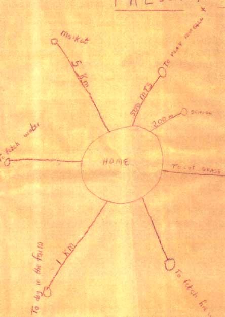 School B pupils were not asked to draw maps of their daily activities. Since they come from a village which bears many similar characteristics to the village of the School A case study, the assumption could be made that their non-school activities are also similar. One difference observed about school pupils at School B was the greater degree of poverty in general. Many of the children at the school have evidently suffered malnutrition, and are physically smaller than would be expected for young people of their age. A considerable number of pupils were seen to remain in the school grounds during the lunch break, unlike School A where the grounds emptied rapidly. Teachers stated that some pupils would not find any food at home at that time of the day; since there were no school meals they had no choice but to remain and play games or sit around until the afternoon session recommenced.