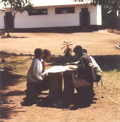 Ultimately all the pupils did repeat the sentences correctly. It was unclear, however, whether they had learned the meaning of the sentence, or whether their skill lay in expert mimicry. In a Standard V English lesson observed (Photo 5), pupils obviously had a greater understanding of what they were reading, although in a class of 65 there was one book for every seven or eight pupils. As the pupils were sitting in rows, half of each group were effectively reading the book upside down, but still managing to repeat in unison the short sentences read aloud by the teacher. One ramification of this strategy of chanting, along with the frequent use of singing, is the sheer noise emanating from each classroom. Since the roofspace between each classroom is not sealed, it is sometimes almost impossible to hear the teacher talking if the pupils in the adjoining room are singing or chanting.