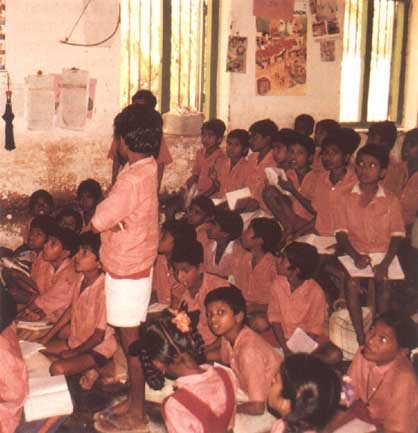 In both pupils' and teachers' matrix ranking, 'teacher reading from textbooks' is consistently ranked lower than 'pupils reading form text books'. The activity itself may not be an effective method of learning, but given a choice between the teacher or pupils doing it, the preference is towards the pupil doing the activity. A classroom observation of a Kannada lesson illustrates this point. The teacher started the lesson by asking the pupils a few questions to motivate them. She then read the text and the pupils listened. After a few minutes she asked a pupil to volunteer to read the text. A number of pupils, one after the other, stood at the front of the class to read the text. The teacher then attempted to develop skills of listening and reading with comprehension.