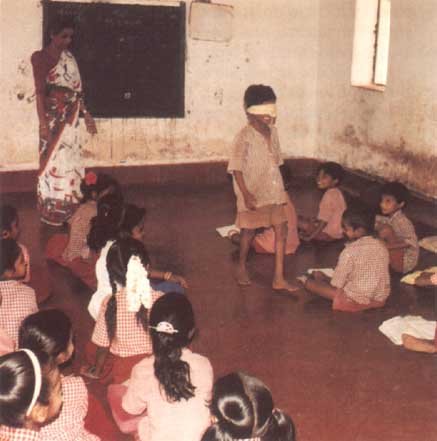 'Pupils learn by doing', received a high rank by teachers and pupils. During classroom observations it was noted that this method of teaching was, to a certain extent, taking place in the classroom. A Kannada language lesson was observed in class II (Photo 7). The room was quite cramped and did not allow the teacher to walk easily between the pupils. A poem had been written on the blackboard which the pupils were to follow and sing. A pupil was then asked to come to the front of the room and lead the rest of the class in singing the poem by reading and pointing at the words on the board. The teacher moved round the children and helped them to pronounce words correctly. There was good participatory learning in a difficult learning context. In a class IV science lesson on sense organs, the teacher asked a pupil to walk towards a door and asked him whether the task was difficult. She then blindfolded the pupil and asked him to repeat the same task. 'Now do you find it difficult?'. All of the pupils were laughing and paying attention to the lesson. The teacher has succeeded in arousing the interest of the children (Photo 8). Pupils may rank 'pupils learn by doing' high as in this case it may be interpreted as doing homework; reading and writing is a frequent activity in the mapping diagrams. In the school there is no project or group work. 'Pupils write' receives a relatively high rank from both class IV and V. This is evident from the mapping activity, in which pupils, despite being asked to draw pictures to illustrate activities, wrote (poorly) the activities they did.