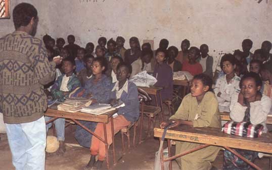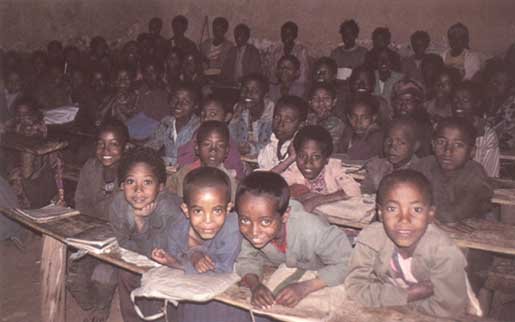 Ethiopia has over the past few decades seen many changes to its education system due to economic and political change. A document by the Transitional Government of Ethiopia (1994) states that there has been a gradual decline in the quality of education which has been pronounced in the past two decades. Factors such as scarcity of instructional materials, overcrowding, inadequate school buildings and a decline in the quality of teacher training have contributed to the problem. Moreover, the curriculum lacked relevance with no clearly defined objectives. Instruction concentrated more on theoretical knowledge with little connection to daily life. The approach lacked problem solving skills with a high tendency towards rote learning. Participation rates at all levels were very low with disproportionately low female representation, and the few schools available were mainly located in urban areas. The government (1994) states that almost all of the junior and secondary schools, with a total enrolment of 12% of the eligible age group, are located in the medium and large towns. Nearly 60% of rural communities have no schools. The poor access to primary schooling for children in rural areas was revealed during the fieldwork, when a fair proportion of children said that they had walked long distances, taking up to two hours, to attend school. (Poverty is another main reason for not attending school as children are needed to work at home where food production is likely to be a higher priority than education. During the fieldwork it was clear that many children, both boys and girls, are involved in agricultural activities daily. Pupils mentioned that homework had to be done at school because they had too much work to do at home.) Overall enrolment rates are low; UNICEF (1995) estimate the primary school enrolment ratio (gross) at 25% over 1986-92.