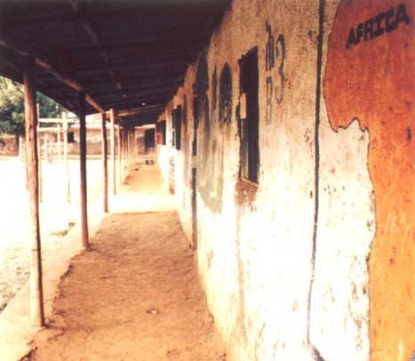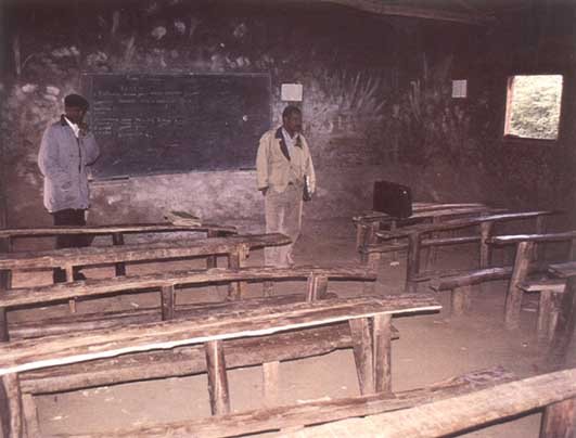 The school was established in 1965. It is a government school with grades 1 to 8. Grades 1 and 3 each have 3 sections due to large pupil numbers, grades 2 and 7 have 2 sections each, and grades 4,5,6 and 8 all have 1 section. There is one classroom for each section. Grades are not divided according to ability and there is often a great variation in pupils' ages within a grade. Classrooms are constructed from wood, mud and straw (Photo 2) with few windows and little ventilation. There are not enough benches or desks for pupils, conditions are very cramped (Photo 3 & Photo 4) and overall the classroom size (10 x 6 m2) is inadequate for the number of pupils. There is a library/staff room, directors office, pedagogical centre (Photo 5) and a small office for equipment. There are two toilet blocks and facilities for boiling water (to make tea). The school has a solar powered radio, given to the school through a donor agency 'Audio Distance Education' programme.