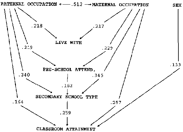 Secondary schools: Regressions undertaken at the secondary level showed a different picture than the primary schools - especially because of the stratification of secondary schools and the different social class profile of the distinct types of secondary school. Variables used in these stepwise regressions included sex of child, occupation of father, occupation of mother, type of secondary school attended, pre-school attendance, with whom the child lived and who helped the child with homework. Using CEE scores as the dependent variable a massive 56.5% of the variance was accounted for; the main contributions to this variance were type of school - sixth form or not (44%), occupation of mother (12.2%), occupation of father (2%), sex of student (0.7%), and with whom the child lives (0.6%). Using the standardised end-of-term scores as the dependent variable, the explanation of variance was much more limited: only 6.8% of the variance was accounted for - and the sole contribution was made by the sex of the student. Finally, the raw end-of-term scores were used as the dependent variable and 14.5% of the variance was accounted for; the main contributions to the variance were type of secondary school (7.5%), attendance of pre-school (3.1%), sex of student (2.9%) and occupation of father (1.1%). Figure 4.1.2 displays how the correlations between these significant variables contribute to classroom attainment.