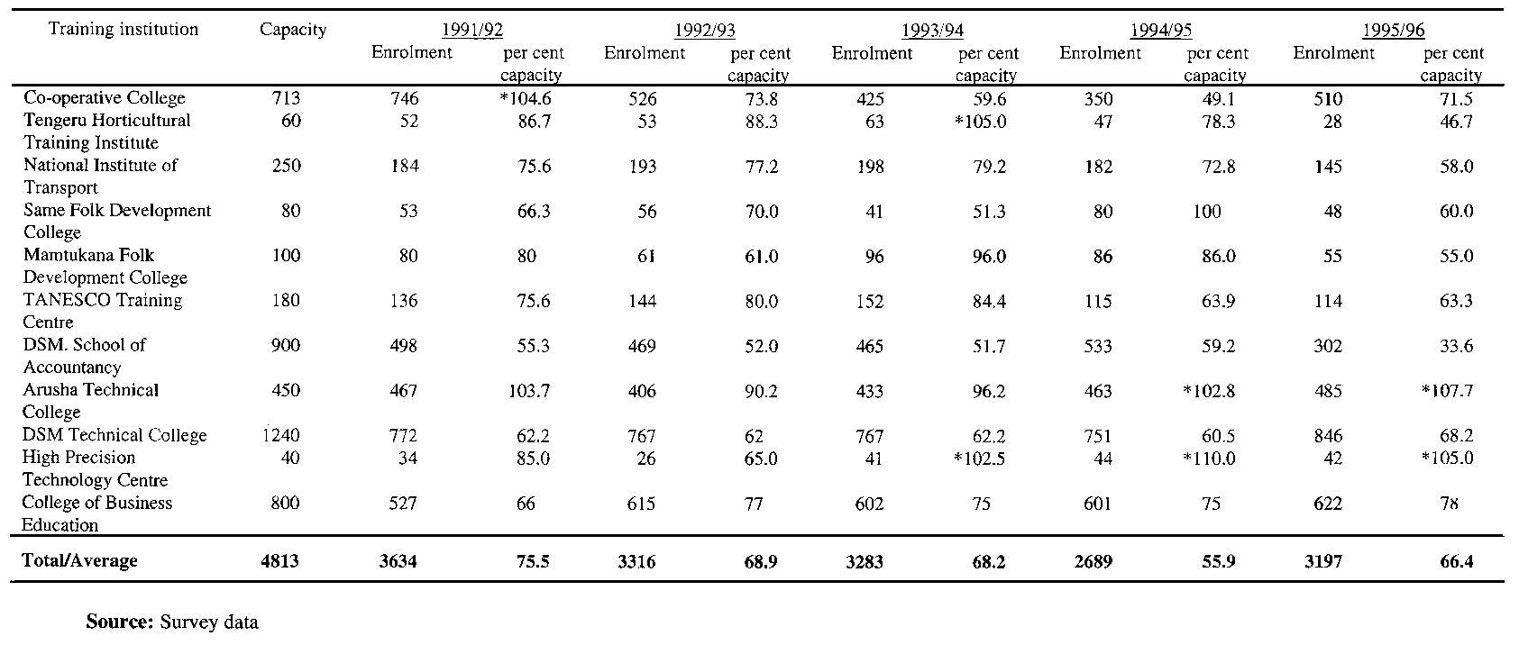 Table 3.2 summarises the main changes that have been made to training courses at the survey training centres. Most centres have made some changes to the content and duration of existing training courses as well as introducing new courses in response to new market demands. These changes have been greatest at the commercial training centres in Dar Es Salaam and Arusha (the two schools of accountancy and the College of Business Education), the Co-operative College in Moshi, some of the Folk Development Colleges and the two technical colleges. In overall terms, however, only about one-third of the survey training centres have made 'major changes' in the type of training they offer since the late 1980s.