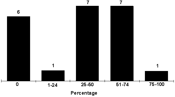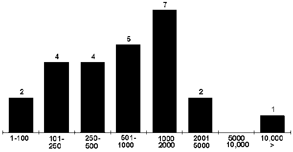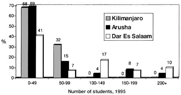 During 1996, almost 5000 individuals enrolled on training courses offered by the 79 survey PSTIs where enrolment data was made available. Figure 4.2 shows the size distribution of enrolments among these PSTIs. What is most striking is that the large majority of centres had only very small enrolments; nearly two-thirds had fewer than 50 students in 1996 and only 14 PSTIs (16.3 per cent) enrolled more than 100 students. These relatively large centres are located in the Arusha and Dar Es Salaam Regions. Given their illegal status, it is not surprising to find that non-registered PSTIs tended to have smaller enrolments than registered PSTIs. In the Arusha Region, for example, only one-third of registered PSTIs had fewer than 50 students in 1996 compared with 93 per cent among the non-registered centres that were surveyed.