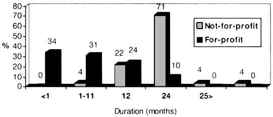 Two-thirds of the training offered by the survey PSTIs in Tanzania during 1996 was in the traditional manual trades (see Table 4.3). Tailoring was by the most important course, accounting for almost one-third of total enrolments followed by electrical installation (13.2 per cent), auto-mechanics (8.9 per cent), carpentry (5.5 per cent) and masonry (3.1 per cent). Three quarters of these courses required full-time attendance for at least two years and less than 5 per cent were less than one year in duration (see Figure 4.3). In overall terms, the not-for-profit centres were responsible for 55 per cent of training in the manual trades. However, it is noticeable that the for-profit training centres accounted for more than 10 per cent of enrolments in only three trades - electrical installation (87 per cent), motor mechanics (58 per cent), and tailoring (39 per cent). It would appear, therefore, that the remaining trades (including carpentry, masonry, plumbing, and welding) were not commercially viable.