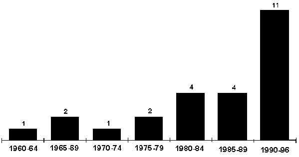(a) The pre-adjustment period. Only 14 (16.3 per cent) of the survey PSTIs were established before the advent of economic liberalisation in 1986. Only four of the for-profit PSTIs were in operation prior to this date with just one centre in Dar Es Salaam. This paucity of private sector training provision was largely the consequence of the CCM government's socialist development strategy which it had pursued since the Arusha Declaration in 1968 which, inter alia, strongly discouraged private sector involvement in the education and training sectors. The early emergence of a relatively sizeable group of not-for-profit PSTIs, particularly in the Kilimanjaro Region was the result of the strong moral commitment of the Lutheran and Catholic Churches to augment government efforts to provide skills training for primary school leavers, mainly for self-employment.(b) The early-adjustment period. During the first five years or so of the Economic Reform Programme, there was a marked increase in the number of PSTIs that were established, particularly among the for-profit group in Dar Es Salaam.