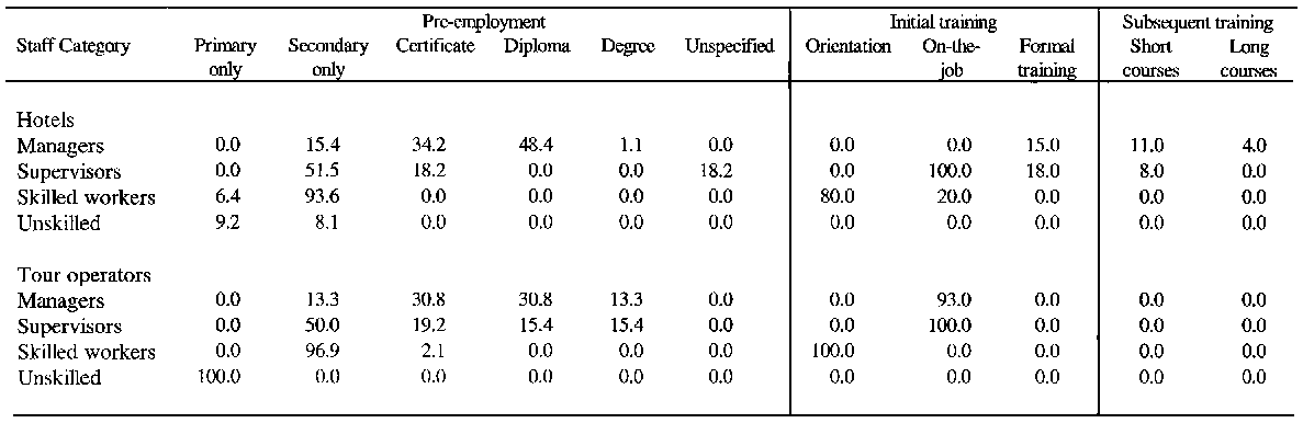 Forty percent of the hotels and tour operators used foreign trainers in order to achieve specific training objectives. Duration of training (which was both on and off the job) ranged from one week to three months. Over 90 per cent of respondents ranked this training as 'effective' or 'very effective'.