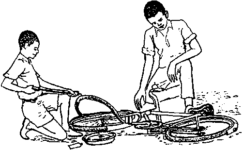 carrier, shoes, two boys, trousers, puncture. I am mending my bicycle. To find