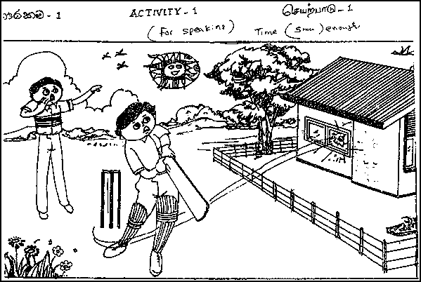 The task comprised of an illustration, taken from a reading book in for ten year old children in Sri Lanka - Lets Go to the Fair. The illustration is of a mother and her two children buying fruit from a fruit stall. The selected students were to look at the illustration and talk about it.