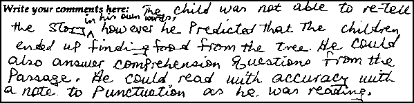 As described in chapter 3, teachers met in groups on several occasions to discuss the samples of childrens work. Each teacher brought to these meetings, samples of childrens records (oral language was recorded verbatim on the teacher record sheet), their own assessment of the level these samples had achieved and the teachers written comments of the work, justifying the level awarded. Teachers were encouraged to bring samples of those childrens work who they had rated as doing well, average performance and experiencing difficulties.