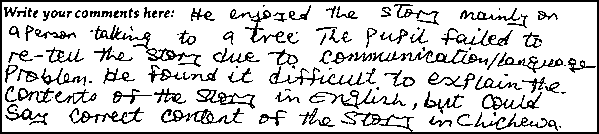 The following examples drawn from oral samples in Malawi gives an illustration of the kinds of work considered to be at levels 1-4. In these examples, the verbatim records as written by the teachers are illustrated in the boxes below and the teachers comments, justifying their decisions to award a particular level, are also reproduced.