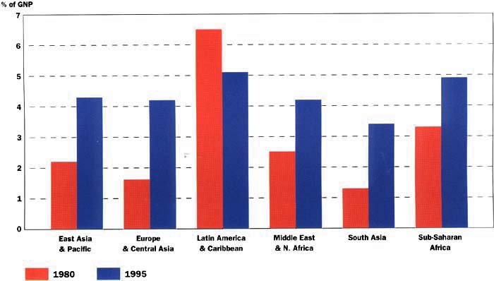 Source: World Development Indicators 1997.3.62 Following a British initiative, a new programme of relief for Heavily Indebted Poor Countries (HIPCs) was agreed at the annual meeting of the IMF and the World Bank in September 1996. For the first time, these and other multilateral institutions will provide relief on debt owed to them. In parallel, the Paris Club will increase its maximum rate of debt reduction by up to 80 per cent. The key objective is that any poor country which follows sensible economic policies should be able to achieve debt sustainability, which means that their levels of debt must be affordable without the need for further rescheduling.
