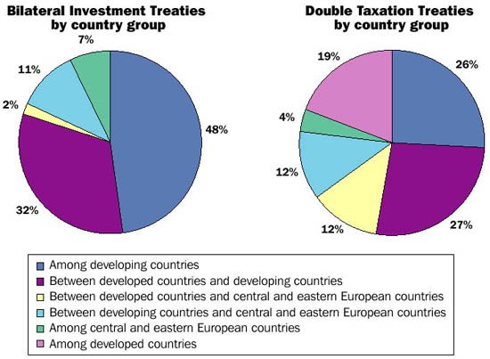 FIGURE 4.2 Bilateral Investment Treaties and Double Taxation Treaties concluded in 1999 The growth of Foreign Direct Investment (FDI) has led to a growing number of bilateral treaties on investment and double taxation. Many of these are between developing countries - reflecting the growth of FDI between these countries. In 1999,96 countries signed a total of 130 Bilateral Investment Treaties, nearly half of which were between developing countries; 85 countries signed a total of 109 Double Taxation Treaties, a quarter of which were between developing countries. |
