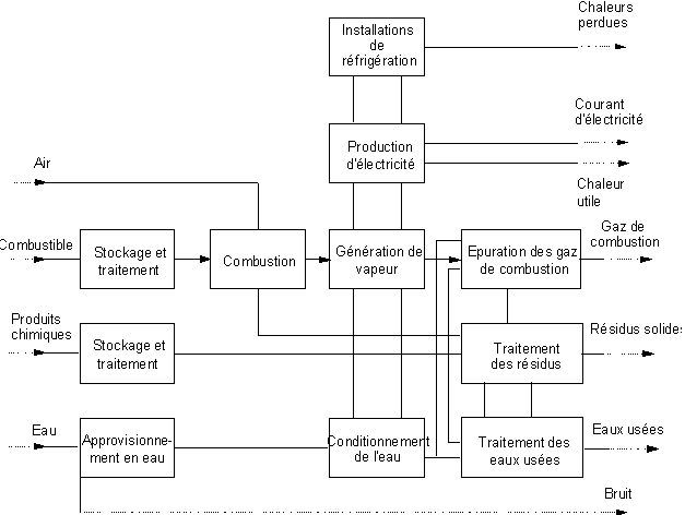 En ce qui concerne les interactions d'une centrale thermique avec les autres secteurs industriels, il importe de tenir compte de tous les maillons de la chaîne de production, de l'extraction du combustible à l'évacuation des déchets (cf. Point 5). Par ailleurs, l'approvisionnement en eau de la centrale se trouve imbriqué avec le réseau public d'alimentation en eau lorsque les deux systèmes utilisent les mêmes ressources hydriques et que celles-ci sont limitées.