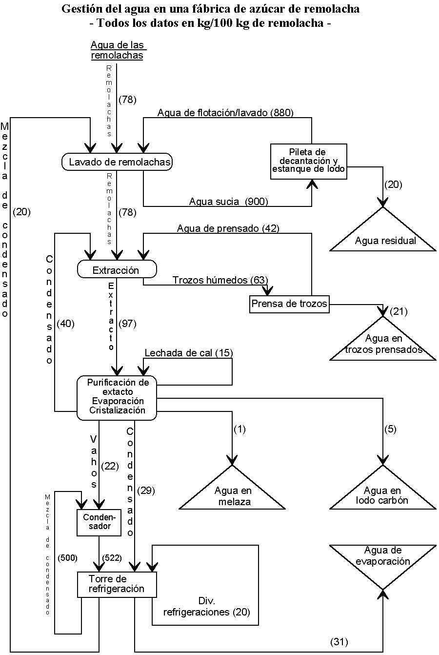 La producción de aguas residuales puede reducirse a un mínimo optimizando el diseño de los circuitos internos del agua y aplicando métodos de depuración de eficacia comprobada (degradación en estanques escalonados en lagunas/plantas depuradoras biológicas). Un control consecuente de los procesos tiene que excluir la posibilidad de que soluciones azucaradas pasen a los circuitos del agua. Así no sólo se reduce la contaminación, sino que además se incrementan el rendimiento y la rentabilidad. Los depósitos de residuos de filtrado y tierra pueden utilizarse para mejorar los suelos después de degradarse la carga contaminante. La generación de biogás como combustible debería tenerse en cuenta al planificar nuevas fábricas.