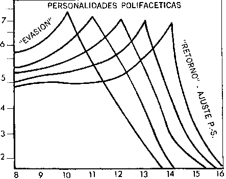 Se nos ha ocurrido que se podría esquematizar la curva evolutiva de la psicología del adolescente, asimilándola gráficamente a las conocidas curvas del crecimiento físico durante cl brote puberal (Fig. I) como una línea en forma de meseta, transcurriendo en el "tiempo social" de los 10 a los 20 años de edad, con una rama ascendente que representa los procesos psico-sociales que apartan violentamente al individuo de los moldes típicos de las edades precedentes (pro-escolar y escolar), o sea una primera fase de auto-alienación, llamadas algunas veces "de evasión" o de psico-dinamismo por lo que el individuo trata de alejarse de las identificaciones y de los conceptos de la época en que era niño; en segundo lugar, una rama horizontal con diversos salientes que recuerdan las múltiples variables individuales de personalidades polifacéticas, cambiantes, inestables y sobre todo transitorias; y por último, una rama descendente, o "fase de retorno", en la que los mecanismos homeostáticos de ajuste psíquico deben llevar al adolescente al encuentro adecuado y a su incorporación útil y positiva del "hombre social" adulto.