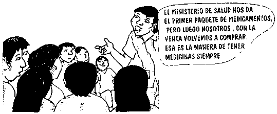 Puedes hacer esto con varias personas individualmente y luego en una reunión que tengas, ellas van a ser los principales defensores de que los productos que tienes en el Puesto de Salud son más baratos, además que comprando en bodegas o Farmacias particulares quien se beneficiará será el bodeguero, comprando en su Puesto de Salud los beneficiados serán ellos mismos, porque esa ganancia pequeña que entra por medicamentos podrá ser utilizada para comprar más Y TENER SIEMPRE MEDICAMENTOS, y que incluso podrás trasladar a los pacientes graves si es necesario.