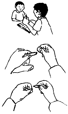 · Limpiar el costado del dedo anular con un algodón con alcohol y dejar secar. También puede utilizarse el lóbulo de la oreja y en niños pequeños el dedo gordo del pie o el talón.