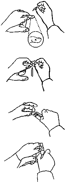 · Sujetar firmemente el dedo (oreja) que se va a punzar sin tocar el área limpia y punzarlo con un golpe seco con la punta de la lanceta.· Limpiar la primera gota de sangre con un algodón seco,