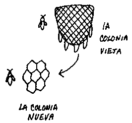 Unos pocos días antes de que salga la primera reina virgen, la reina vieja quita la colonia, seguida por parte de las obreras y zánganos. La reina se para cerca y las otras abejas se agrupan a su alrededor. Mandan exploradores en busca de sitios apropiados para una colmena. Dentro de pocos días, el enjambre se va al sitio donde va a establecer un nido permanente.