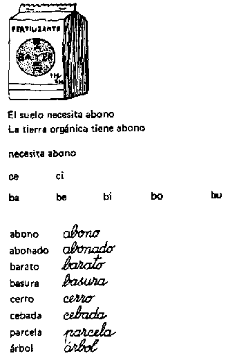 El próximo ejemplo es de un proyecto de alfabetización funcional en Ecuador el cuál enfatizó la presentación de prácticas agrícolas modernas, el concepto clave de que "el suelo necesita abono". Las palabras claves (necesita abono) se repiten inmediatamente debajo de la oración principal y las sílabas de esas palabras - "ce" y "bo" - se enfatizan para los ejercicios de lectura y repetición. Entonces, se presentan en impreso y en cursivo varias palabras relacionadas con la agricultura para la práctica de la lectura.