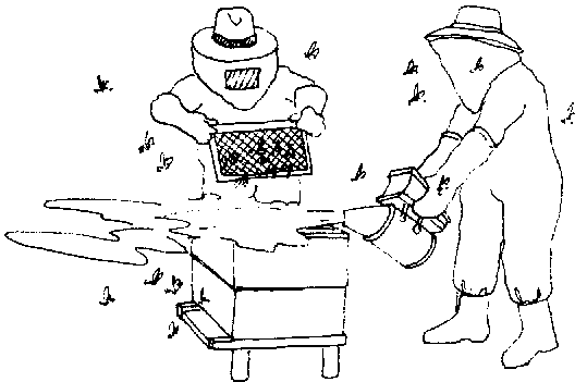 Trabaje siempre con un compañero. Uno utilizando el ahumador, mientras que el otro revisa la colmena. Mantenga una capa de humo sobre la colmena todo el tiempo.