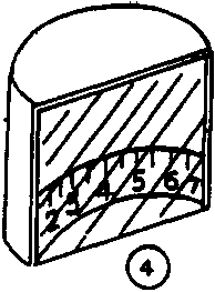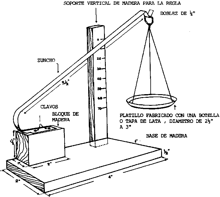 1. Clave los dos pedazos de madera (2 y 3 antes mencionados) a la base de la manera que se muestra en el diagrama. Una un pedazo de papel cuadriculado a la regla de medida de madera.