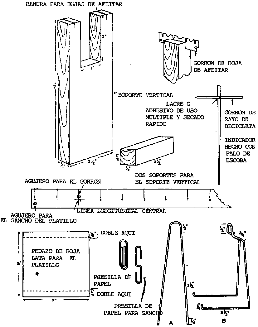 5. Se puede fabricar un platillo de pesado con pedazos de hojalata (por ejemplo, de la topa de una lata de querosén). Use hilo y un gancho liviano, fabricado con un alfiler recto, para unir el platillo de pesado a la estructura del rodillo.