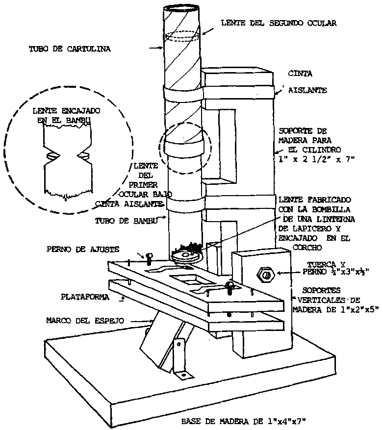 31. El lente del segundo ocular: Tome el otro lente de relojero y colóquelo sobre el tubo de bambú abierto. Si la imagen llena el campo de visión, asegúrelo. No obstante, si no llena el campo de visión, mueva el lente hacia arriba y hacia abajo hasta que encuentre el lugar donde la imagen tiene el mayor tamaño.