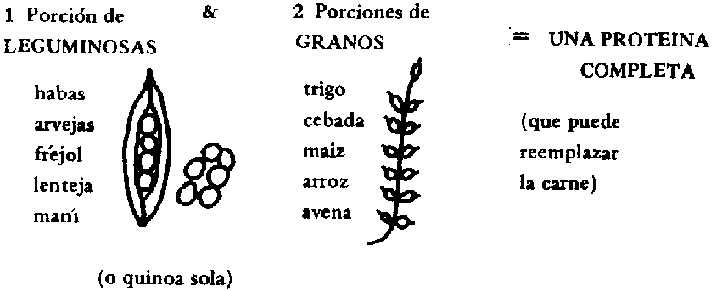 "Los alimentos que nos forman" son de dos clases. Los de origen animal - carne, leche, gallina, pescado, huevos, queso - generalmente son los más ricos en proteínas. Los alimentos de origen vegetal como fréjol y lentejas también contienen proteína, pero para aprovechar mejor de la proteína que tienen, se debe comerlos en combinación con otro grano - por ejemplo, con arroz, maiz, avena, trigo o cebada. Un grano particularmente rico en proteína es la quinoa.