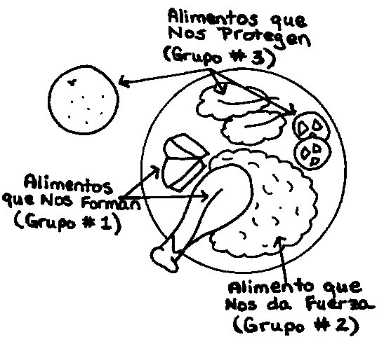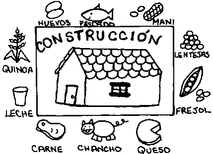 Primero, para una casa se necesitan materiales buenos y fuertes. ¿Qué se necesita para construir una casa? "Ladrillos", "Cemento ", "Piedra" "Madera", "Tejas" ¡Si! Así mismo necesitamos materiales fuertes para construir nuestros cuerpos. El primer grupo de alimentos es el material de construcción. Sirven como los ladrillos y cemento para una casa. Estos alimentos son las proteínas o "los alimentos que nos forman". Sirven para construir y reparar el cuerpo. (Ahora haga una lista de los alimentos en este grupo).